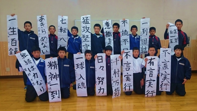 続いて平公民館で新年会を開催し、これも恒例の餅つきと書初め。選手の餅つきでは、うすのフチを何度かクリーンヒットして、コーンと乾いた音が響いていました。的としては、もちはボールより大きいのですが…。