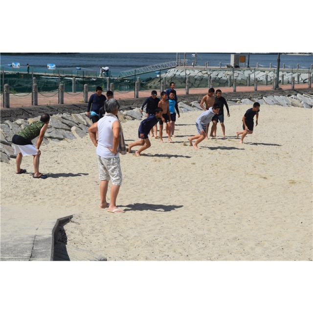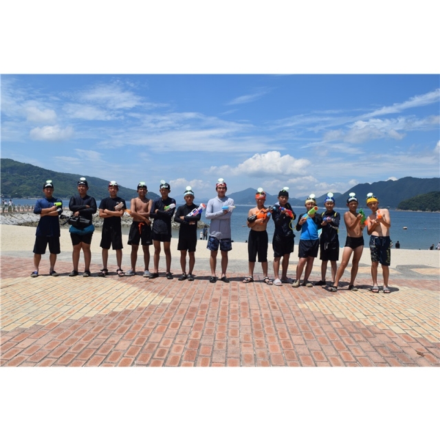 翌2日目は楽しみにしていた海水浴、伯方島ビーチにお邪魔し、海水浴かと思いきや、そこは我らが中央、まずは砂浜ダッシュ、ランニングから開始、途中ビーチのアナウンスでチームを紹介してもらうハプニング?もある中、レクレーションとして水鉄砲合戦も行い、いつもと違う選手の活き活きした姿に参加した父兄も疲れが吹き飛ぶ2日間でした。