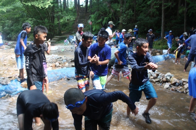 午後は『山びこの丘』さんへ移動して、今度は川でマス掴みを体験しました。魚を素手で掴むのは、ちょっと大変!でも取れた時はみんな笑顔でした。川には中学生1年生のOBさんたちが遊びにきてくれました!!ありがとうございました。