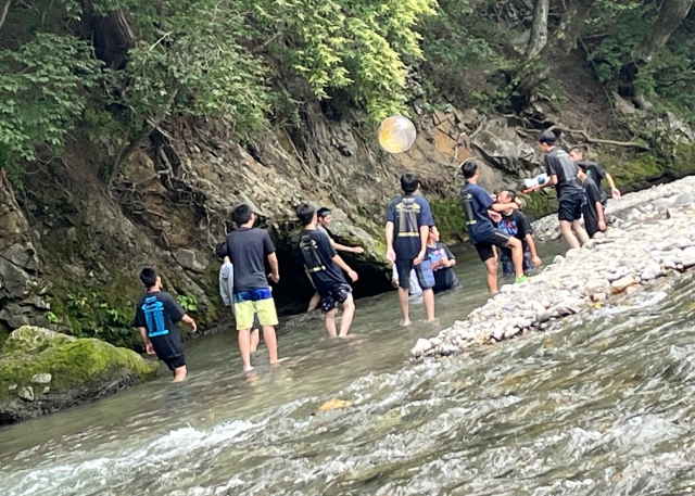 例年行われていた指導者主催のBBQも、コロナ禍で3年行う事が出来ませんでした。今年は3年ぶりに開催出来ました。前日3年生はコテージに泊まり、そのまま河原GO!!1.2年生は現地集合で、全学年で行いました。指導者の方々が飲み物、お肉、エビ、サザエ、カキや、焼きそばなど、沢山の食べ物を、全て用意して頂きました。川遊びも大人も子供も、思い切り堪能し、楽しく遊ぶ事が出来ました。雨の心配もありましたが、普段の行いが良く、とても良い天気となり、1日遊ぶ事が出来ました。