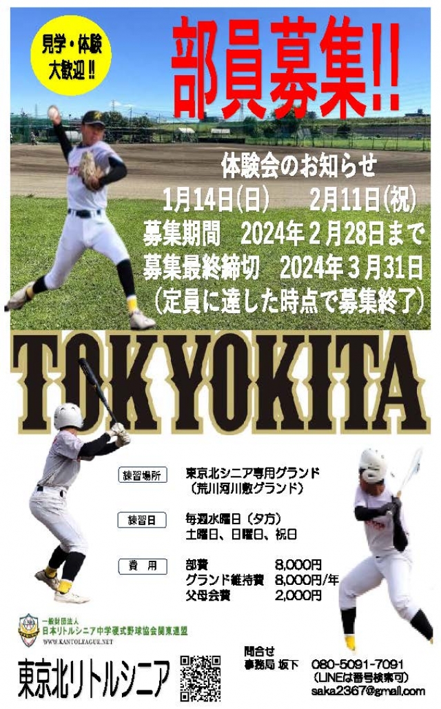 氏名(フリガナ)、チーム名(区・市)、ご父兄連絡先、参加時間帯をお知らせください。
