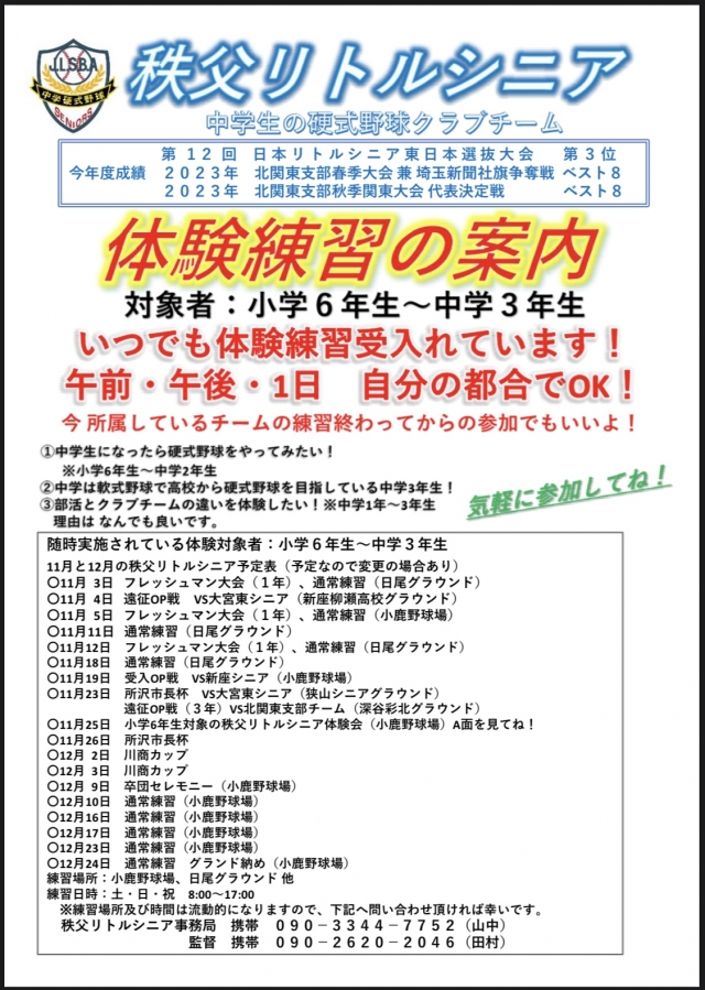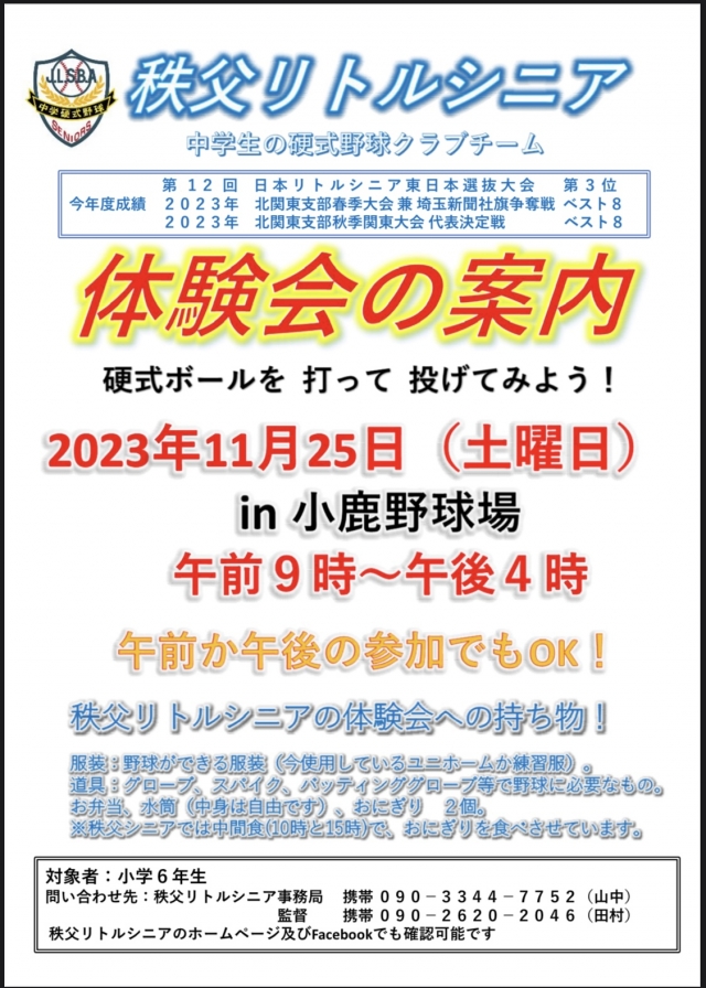 『秩父リトルシニア体験会2023』を開催します。