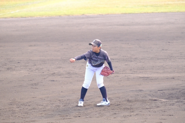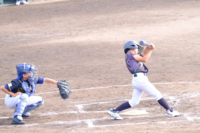 1試合目は清和チャイルダー戦。先発は江頭ユウキ。昨日の練習試合ではナイスピッチングができたため、大事な先発を託されます。1回にいきなりショートゴロエラーでピンチとなり、盗塁、スクイズで1点を先制されてしまします。攻撃面では緊張からくる固さもあり、完全に抑え込まれます。2回・3回に1点ずつを失い、0-3で迎えた3回ウラ、フウマの四球のあと、リュウセイのレフトオーバーのタイムリー2ベースで1点を返すと、ジン、江頭ユウキのタイムリーヒットで5-3と逆転に成功します。逆転するとリラックスしたのか、どんどん石薬師ペースとなり、13-3の4回コールドゲームで1勝することができました。