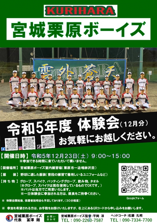 【開催場所】 宮城栗原ボーイズ室内練習場(栗原市一迫嶋躰沢田)