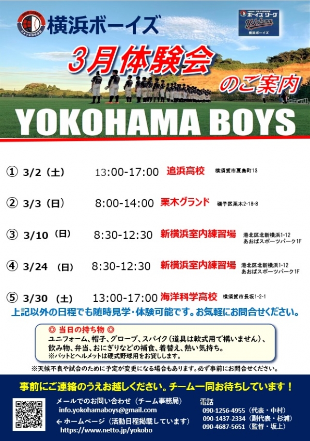 横浜ボーイズ体験会、3月の開催日のお知らせです。