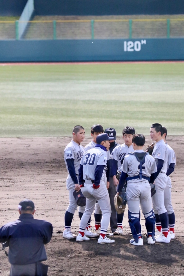 雪も散らつく寒空の中、1点を争う投手戦で試合は始まり、4回に四死球からタイムリーで1点を先制しましたが6回に追いつかれてしまいました。そのピンチをなんとか同点で切り抜けることができました。