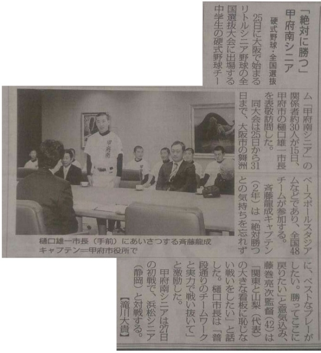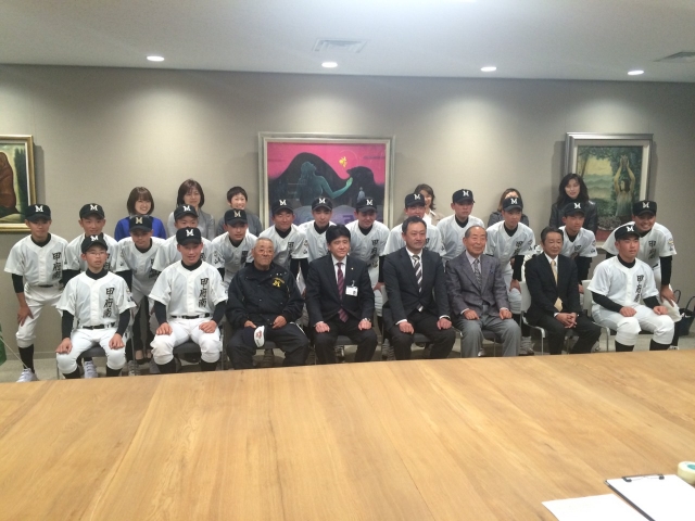 樋口雄一甲府市長を表敬訪問しました。 第22回日本シニア全国選抜野球大会出場の報告をしました。 3/25に、舞洲ベースボールスタジアムで開会式を行い、初戦 浜松と戦います。ご声援よろしくお願いいたします。