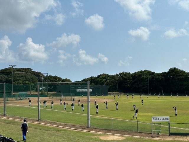 2・3日目は猛暑の中、みっちりと全体練習。厳しいランニングメニューやノックはもちろん、夕食後もバットスイングやトレーニングを行うなど、朝から晩まで精力的に活動しました。