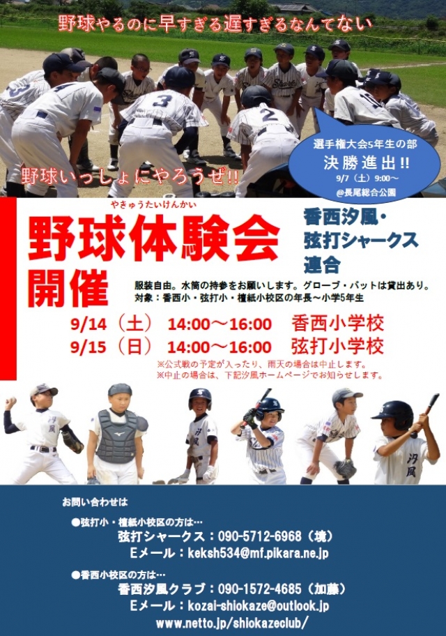 現在は香西汐風・弦打シャークス連合として連合チームで活動中の汐風で、野球体験会を開催します。