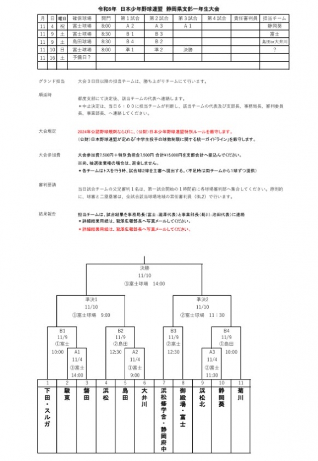 令和6年度 日本少年野球連盟静岡県支部 1年生大会の日程及びトーナメントが決定致しました。