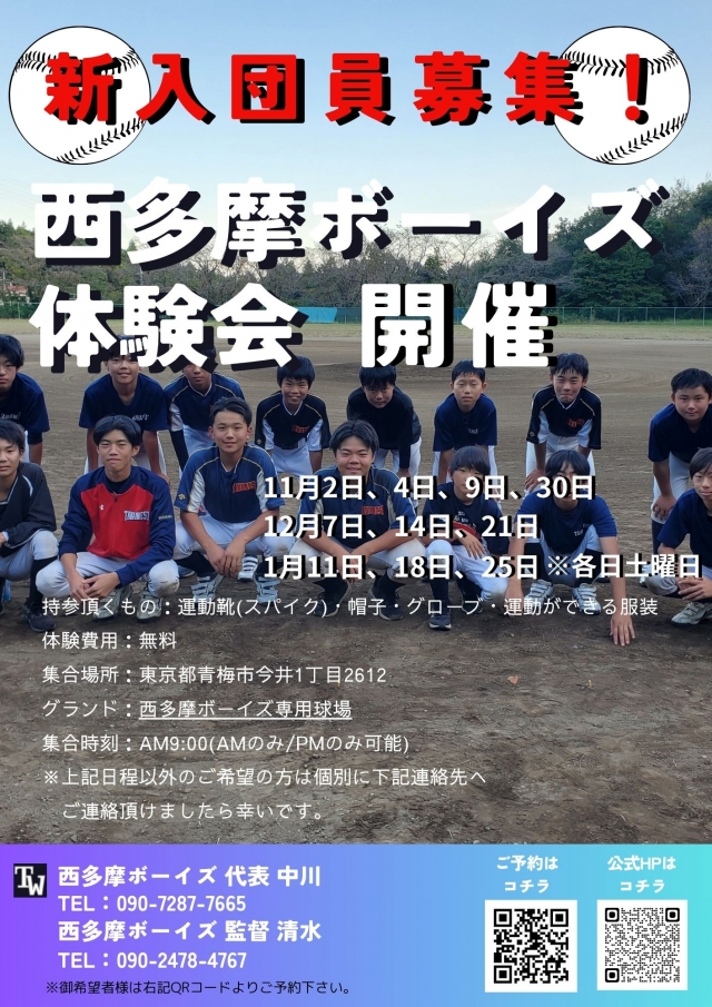 西多摩ボーイズでは下記日程で体験会を開催いたします