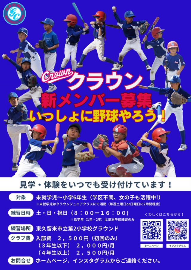クラウンでは、学校や幼稚園・保育園、バッティングセンター、地域コミュニティの掲示板などに、部員募集ポスターを掲示・配布しています。