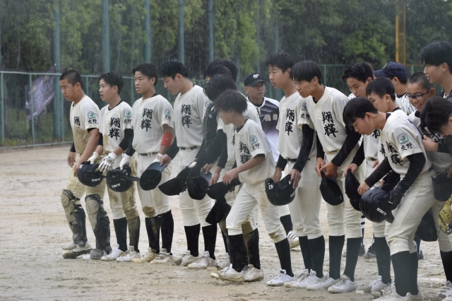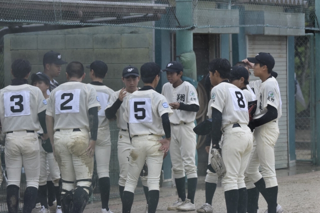 先週延期となった支部予選の敗者復活戦、初戦です。雨模様の中、初回先制点を取り、優位に試合を進めます。強まる雨の中、1点でも多くとっておきたいところでしたが、3回・4回と追加点を入れ、5回降雨コールドで勝利!泉大津大会のいい流れは続いていますね。この調子で次も勝ち進んでいきましょう!