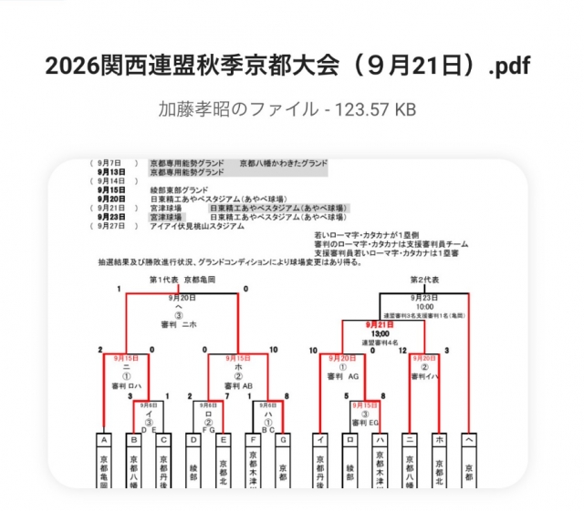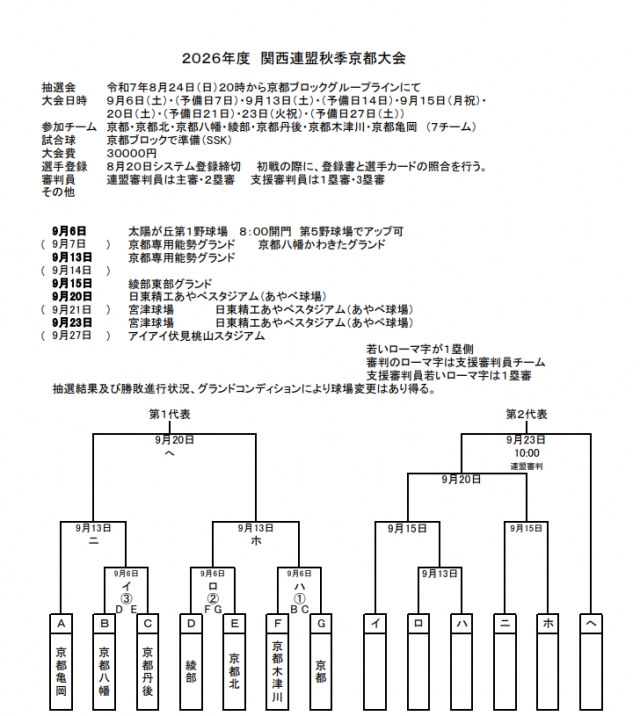 関西連盟秋季大会京都予選 組み合わせ&途中経過