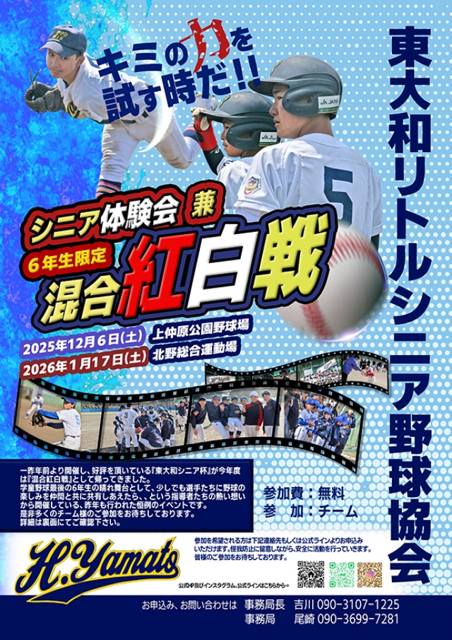 一昨年前より開催し、好評を頂いている『東大和シニア杯』が今年度 は『混合紅白戦』として帰ってきました。 学童野球最後の6年生の晴れ舞台として、少しでも選手たちに野球の 楽しみを仲間と共に共有しあえたら、、という指導者たちの熱い想い から開催している、昨年も行われた恒例のイベントです。 是非多くのチーム様のご参加をお待ちしております。もちろん、個人での参加も可能です。 ご質問や参加のご連絡はお問い合わせフォームもしくは事務局までお気軽にご連絡下さい。
