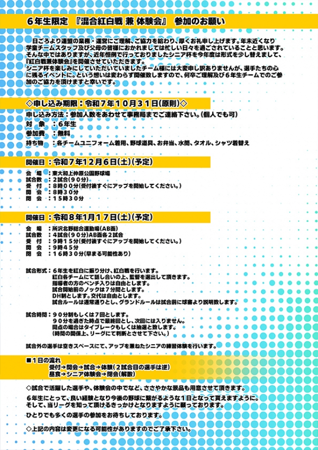 ◇試合で活躍した選手や、体験会の中でなど、ささやかな景品も用意させて頂きます。 6年生にとって、良い経験となり今後の野球に繋がるような1日となって貰えますように。 そして、当リーグを知って頂けるきっかけとなりますように願っております。 ひとりでも多くの選手の参加をお待ちしております。