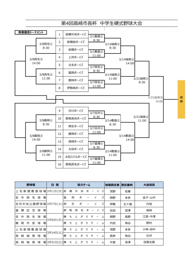 > 第4回高崎市長杯 中学生硬式野球大会 組合せ決定