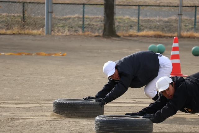 雪が舞う寒空のもと、地道な体力づくりです 今が大切な時期です春に花を咲かせるために頑張りましょう