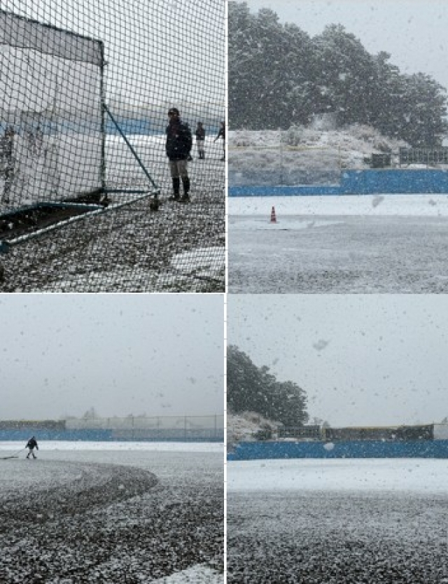 雪の中ノックを受ける選手たち。