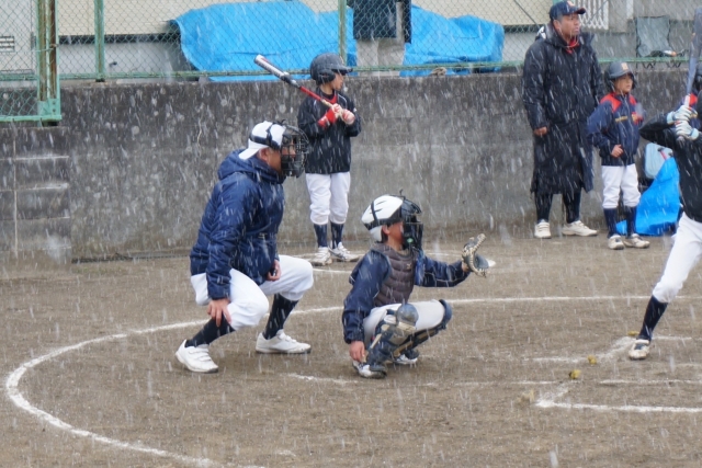 朝から雪がちらつく、あいにくの空模様となった土曜日。❄️そんな寒さの中でも、集合した選手たちは気合十分!しっかりジャンバーを着込んで、まずは午前中の練習からスタートしました。午後は、川崎区から東門前ガッキーズさんをお迎えしての練習試合。12:40プレーボールの時点でも雪は降り続いていましたが、「せめて1試合だけでも…!」という両チームの熱い想いで試合開始!🔥残念ながら2試合の予定を1試合に短縮することとなりましたが、冷たい空気の中で白球を追う姿は、一段とたくましく見えました。対戦いただいた東門前ガッキーズさん、足元の悪い中ありがとうございました!