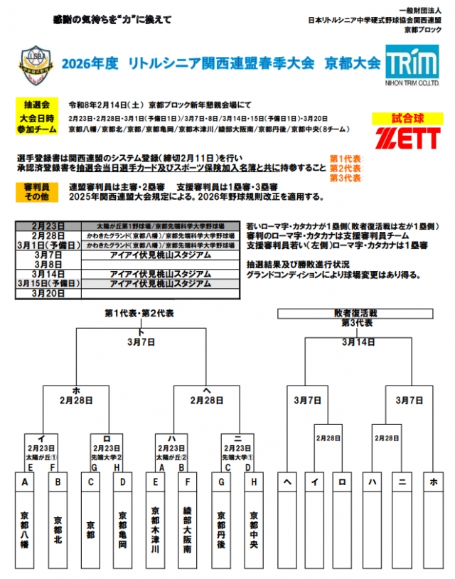 > 2026関西連盟春季大会京都ブロック予選 組み合わせ