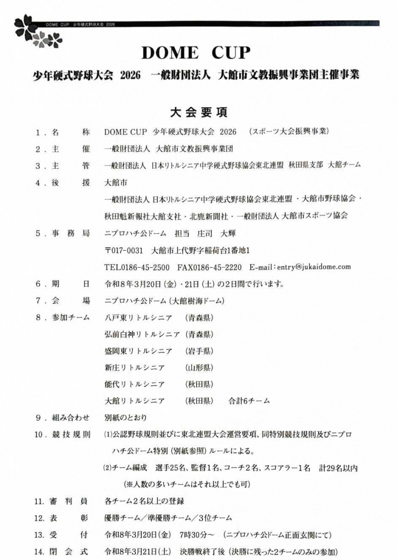 DOME CUP 少年硬式野球大会 2026 開催について