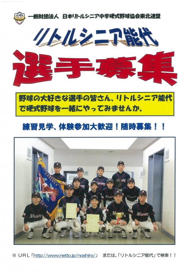 リトルシニア能代では、選手を大募集しています。