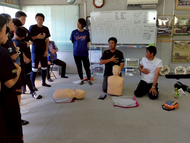 富博記念球場ミーティングルームにて、富岡消防署の方にお越しいただき、またチーム保護者医療関係者のもと熱中症対策・救急救命講習(AED講習)を実施...