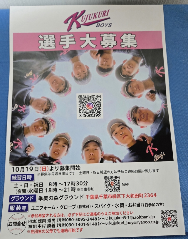 令和8年に中学1年生になる、現小学6年生の体験練習を受付を開始しています。千葉市緑区のホームグラウンドで活動している九十九里ボーイズへ是非お越し下さい。チーム一同お待ちしています。...