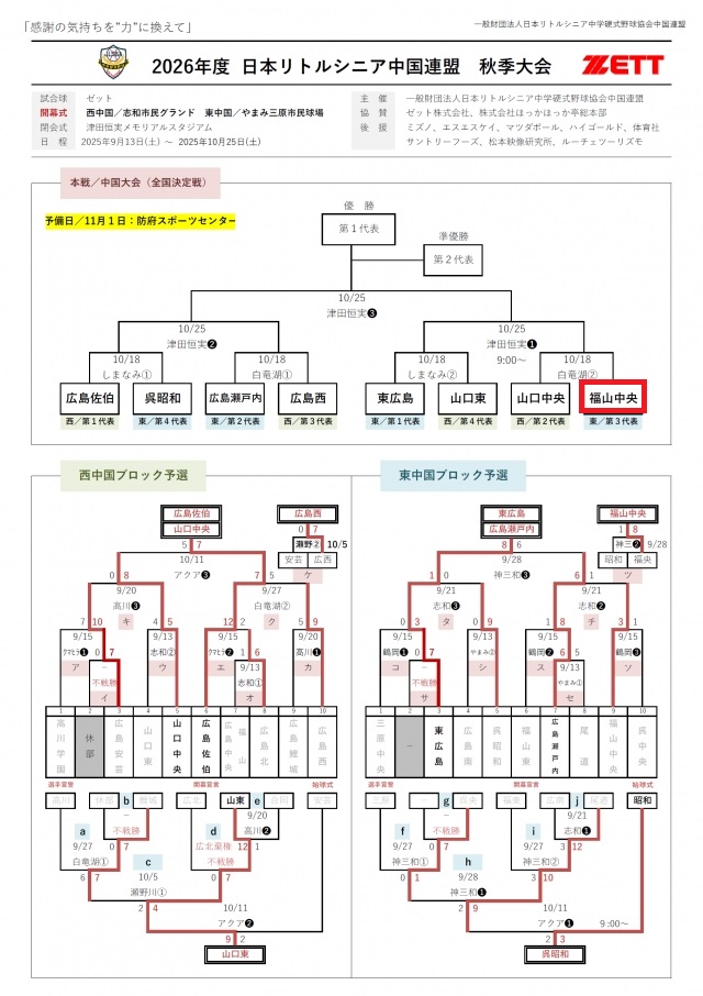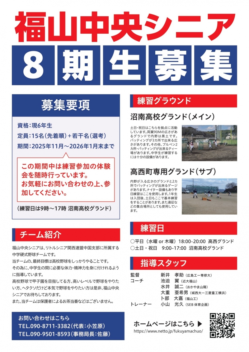 福山中央リトルシニアは、リトルシニア関西連盟中国支部に所属する中学生硬式野球チームです。