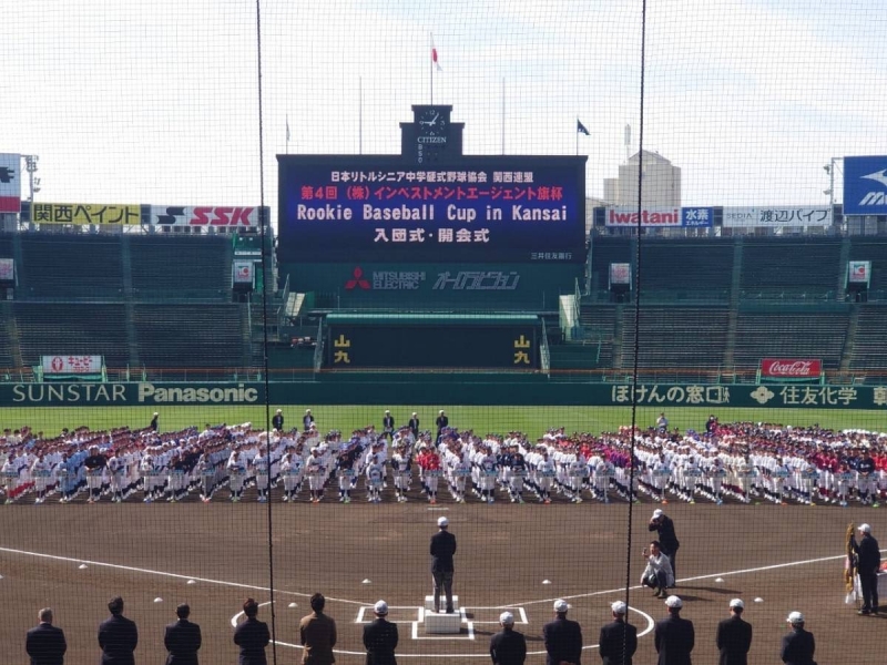 阪神甲子園球場で1年生入団式ならびに「第4回インベストメントエージェント旗杯争奪 Rookie Baseball Cup in Kansai」の開会式を行いました。