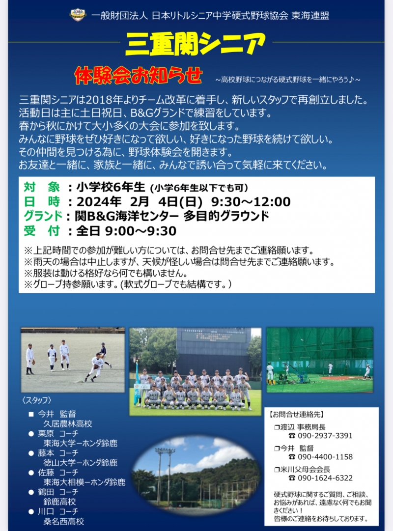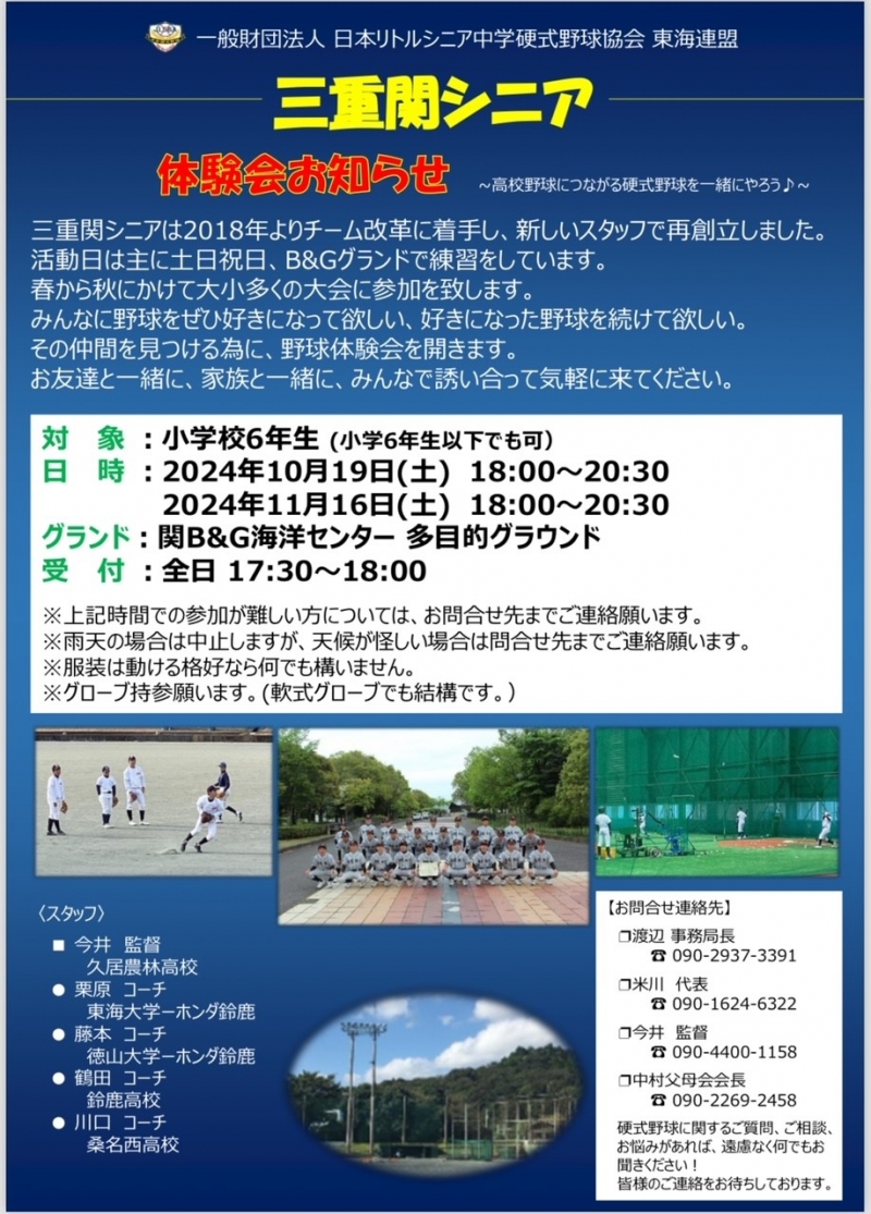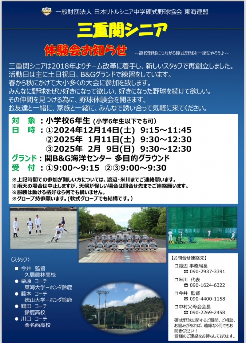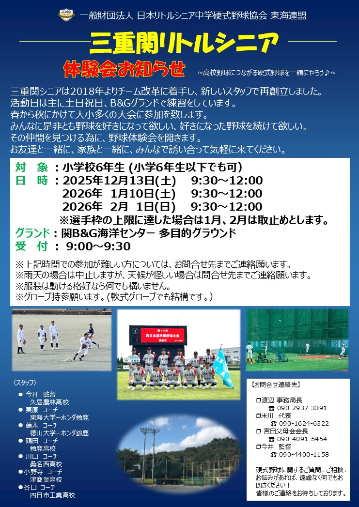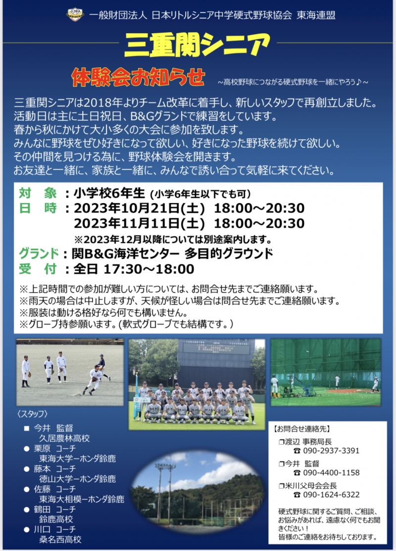 ※体験会や三重関リトルシニアについてのお問い合わせは連絡先の渡辺・今井・米川までご連絡下さい。