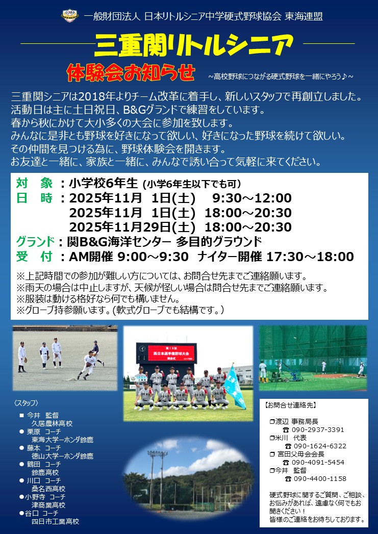 ※体験会や三重関リトルシニアについてのお問い合わせは、連絡先の渡辺・今井・米川までご連絡下さい。