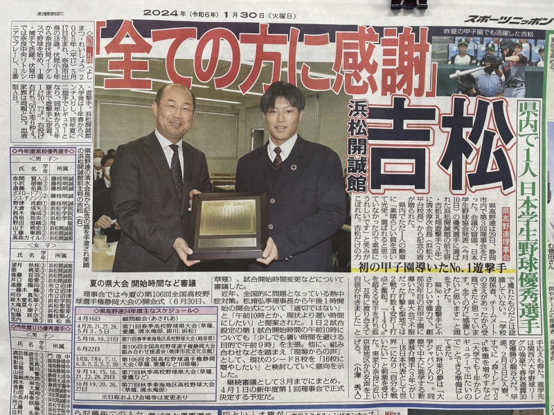 浜松開誠館高校の吉松礼翔君が静岡県高校野球連盟より日本学生野球優秀選手を
