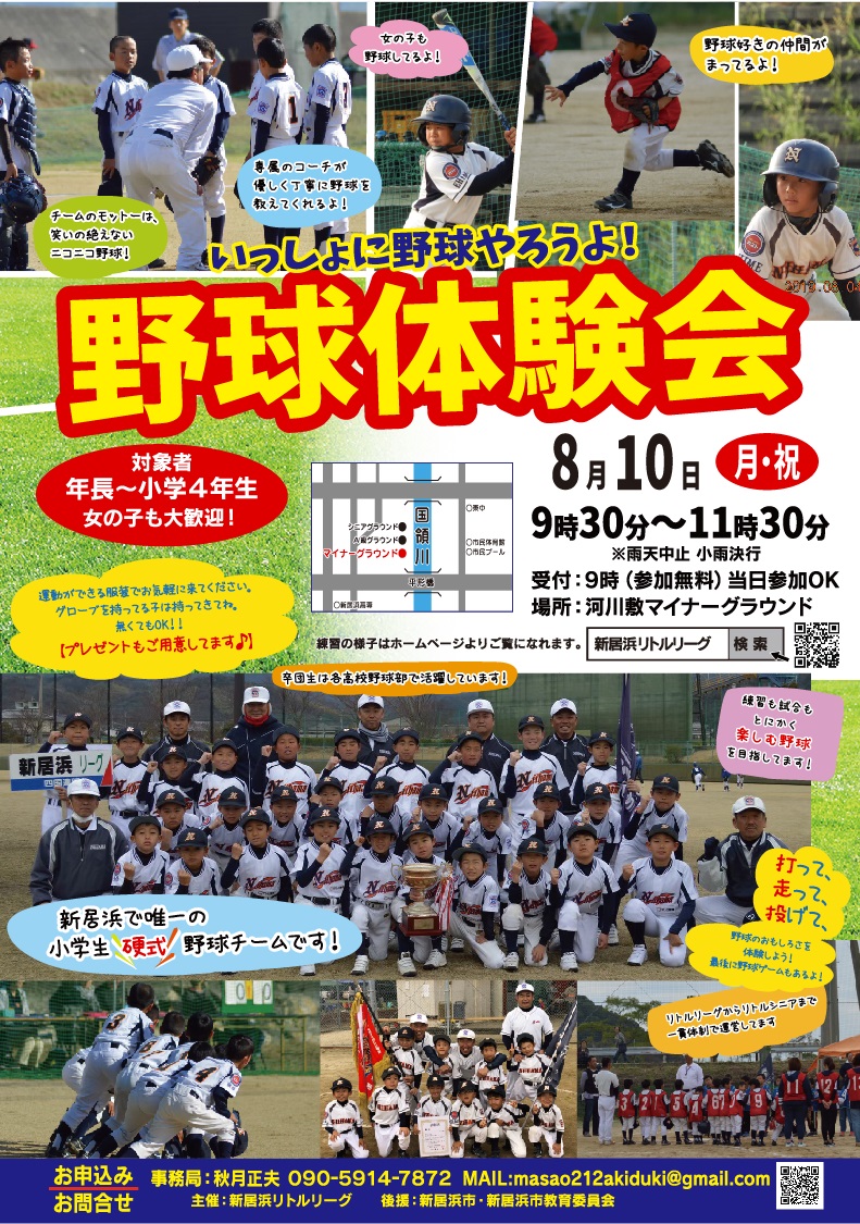 少子化、子供の野球離れが取りざたされている昨今ですが、新居浜リトルリーグは今後も「野球小僧増殖計画」を推し進めて参ります。小学1年~中学3年まで一貫した指導体制と各カテゴリーごとに専用グランドを持つ新居浜リーグは、全国的に見ても恵まれた環境にあり、これも先人から40年間脈々と受け継がれたものです。このたび体験会にご参加いただいた皆様との御縁に期待しながら御礼とさせていただきます。