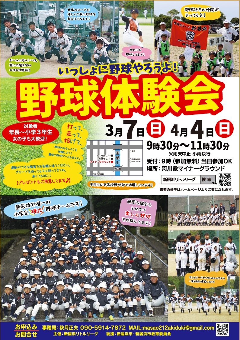 2020年3月8日(日)・3月29日(日)に開催予定の野球体験会は、新型コロナウイルスへの対策として中止とさせていただきます。