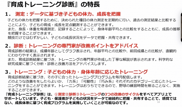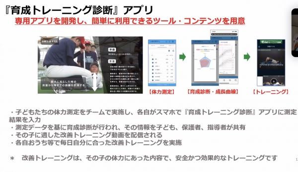 団体スポーツでは、身体的な成長過程にかかわらず、チーム全体で同内容・同負荷をかけたトレーニングとなりがちですが、このシステムでは、選手個々にアプリ配信による個別トレーニングを使用することで、その時々の成長度合いを的確に捉え、身体的な変化が著しい小中学生の成長過程における必要なトレーニングを、その選手にあった内容で、安全かつ効果的に行います。