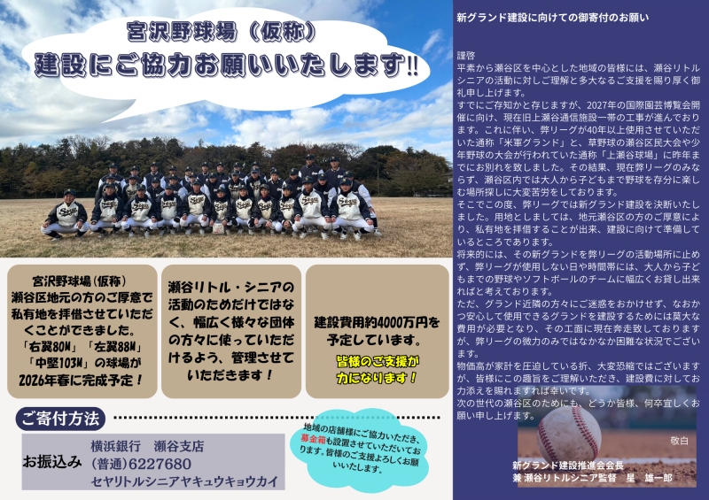 すでにご存知かと存じますが、2027年の国際園芸博覧会開催に向け、現在旧上瀬谷通信施設一帯の工事が進んでおります。これに伴い、弊リーグが40年以上使用させていただいた通称「米軍グランド」と、草野球の瀬谷区民大会や少年野球の大会が行われていた通称「上瀬谷球場」に昨年までにお別れを致しました。その結果、現在弊リーグのみならず、瀬谷区内では大人から子どもまで野球を存分に楽しむ場所探しに大変苦労をしております。